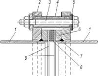 Рис. 5.6. Изолирующий фланец. 1 – стенка трубы; 2 – свободный фланец; 3 – болт с гайкой и шайбой; 4 – текстолитовая труба; 5 – текстолитовая шайба; 6 – приварное кольцо; 7 – сварной шов; 8 – текстолитовое кольцо; 9 – клингеритовые прокладки. Для уплотнения резьбовых соединений следует применять льняную чесаную прядь (ГОСТ 10330-76**), промазанную суриком или свинцовыми белилами; фторопластовый уплотнитель в виде ленты или шнура.