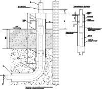 Рис. 5.16. Узел ввода газопровода. Газопроводы на конечных удаленных участках снабжаются продувочными газопроводами, предназначенными для освобождения газопроводов от воздуха перед пуском теплоагрегатов и вытеснения газа воздухом при ремонте, консервации или длительной остановке системы газоснабжения. К цеховым продувочным газопроводам могут присоединяться и продувочные газопроводы агрегатов (печей, котлов, сушилок и т. д.). Продувочные газопроводы выводят из зданий и по наружной поверхности стен прокладывают не менее чем на 1 м выше карниза крыши, в месте, где газ безопасно рассеивается. Для исключения возможности попадания осадков конец газопровода либо загибают, либо монтируют на нем защитный зонт.