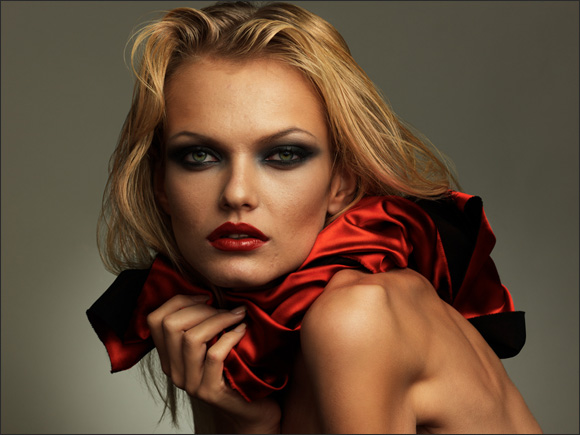 Плечо и рука освещены меньше, чем лицо. Мы увеличили в Camera Raw параметр Exposure, чтобы тело и лицо смотрелись более сбалансированно. Для выделения нужных участков тела использовали инструмент Pen Tool и перенесли выделение на черную маску. Для придания ткани и волосам большего объема мы создали 2 слоя с разными экспозициями (+1 и -1). На черной маске слоя с экспозицией -1 при помощи кисти с различной прозрачностью, усилили темные участки ткани и пряди волос. На слое с экспозицией +1, сделали светлые участки и пряди еще выразительнее. На слое с глазами в Camera Raw были увеличены следующие параметры: Exposure, Saturation, Clarity и Vibrance. Далее по черной маске мягкой 30%-ной кистью прорисовали радужки глаз, чтобы усилить их глубину и немного высветлить. Конечный результат после коррекции в Camera Raw