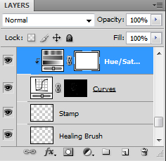 При методе работы над пятнами с помощью кривых, темные пятна могут стать не только светлее, но и более насыщенными по цвету, что может привести к появлению оранжевых участков на коже. Светлые пятна при затемнении становятся, наоборот, менее насыщенными, более серыми. Чтобы избежать этого, для каждого слоя с кривыми создаем еще один слой настроек Hue/Saturation, который корректирует цветовую насыщенность пятен. Мы привязываем слой Hue/Saturation к слою с кривыми, чтобы он действовал только на те участки, над которыми мы работаем. Для этого мы помещаем слой Hue/Saturation над слоем с кривыми и между ними на панели Layers нажимаем на кнопку мыши, удерживая зажатой клавишу Alt.
