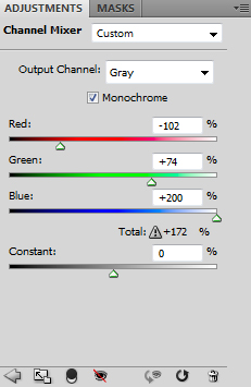 Соответственно, для слоя с высветлением пятен мы немного убираем Saturation, для слоя с затемнением пятен добавляем Saturation. При необходимости можно подкорректировать оттенок с помощью ползунка Hue. Чтобы было удобнее работать, можно создать вспомогательный слой корректировки Channel Mixer. Он должен находиться всегда на самом верху в палитре слоев. В настройках этого слоя нужно поставить галочку в пункте Monochrome, ползунок красного канала увести в минус, зеленый и особенно синий – в плюс. В процессе работы проценты каналов можно корректировать, чтобы лучше был виден тот или иной участок фотографии.