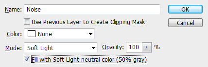Для того чтобы снимок после всех манипуляций выглядел натуральнее, можно наложить шум на некоторые участки лица, имитируя натуральную текстуру кожи. Например, это требовалось для участка, где мы убирали волосы со лба. Мы советуем не злоупотреблять методами замены текстуры кожи. Их нужно использовать только в случаях, когда это действительно требуется. На панели Layers, зажимая Alt, кликаем значок Create a new layer. В появившемся окне в пункте Mode указываем режим наложения Soft Light и ставим галочку в пункте Fill with Soft Light neutral color (50% gray).