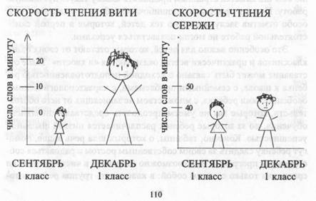 Обычно все задания для самостоятельных работ отличаются по сложности. Как правило, сложность самостоятельных работ возрастает: диктант в сентябре и в январе отличается по степени орфографической насыщенности. Если ребенок в каждой работе допускает одну — две ошибки, это не значит, что он не обучается. Но высших достижений и заметного роста сам ребенок, рассматривая таблицу своих результатов, не обнаружит. Поэтому иногда детям надо устраивать праздники собственного роста. Хотя бы раз в год (или в полугодие) стоит повторять в точности ту же самую самостоятельную работу, что писалась год назад. Например, первоклассники в конце декабря пишут свой первый диктант. Разумеется, в нем будут ошибки и несовершенства. Если провести тот же диктант в мае и показать детям, как они выполнили эту работу полгода назад, гордость за свои достижения неизбежна. Для первоклассников такие праздники роста можно и должно устраивать почаще. Например, в декабре они изучили правописание гласных после согласных, непарных по мягкости-твердости, и написали (разумеется, небезошибочно) первый слоговой диктант: ТЫ, ШИ, МИ, РЯ, ЩА, ВА... Через месяц учителю обычно кажется странным предлагать классу такую пустяковую работу. Но ради праздника безошибочной работы это сделать стоит, особо отметив заслуги именно тех детей, которые в первой самостоятельной работе не могли похвастаться успехами. Это особенно важно для детей, которые отстают от своих одноклассников и практически всегда оказываются «в хвосте». Такое отставание может быть связано с исходной неподготовленностью ребенка к школе, с семейными проблемами, с характерологическими особенностями ребенка, с множеством не зависящих от него обстоятельств, которые мы не умеем преодолеть средствами школьного обучения, но за которые ребенок расплачивается низкой школьной успешностью. Конечно, таблицы, о которых шла речь выше, помогут ребенку следить за своим собственным ростом и радоваться собственному прогрессу. Но невозможно сохранить в чистоте принцип сравнения только с самим собой: в классе есть группа ребят, которые самостоятельные работы выполняют без ошибок, и по сравнению с ними ошибающийся ребенок всегда оказывается в невыгодном положении, даже если его прогресс несомненен. Есть несколько точек в обучении, где исходное неравенство детей можно преодолеть. Таковы, к примеру, показатели скорости чтения — чрезвычайно значимого для младших школьников навыка. Не вина Вити, что его не выучили читать перед школой, и он начинает с нуля. Не является личной заслугой Сережи то, что мама с папой отдали его в прошлом году в замечательную частную подготовительную группу, где мальчик выучился читать в приятных играх и забавах. В сентябре два первоклассника разительно различаются по технике чтения, но результаты первой индивидуальной проверки вовсе не обязательно предавать огласке в классе или на родительском собрании. А вот результаты личного усердия каждого ребенка зафиксировать необходимо. Витя в течение первого полугодья выполнял все задания по чтению, и его скорость выросла от нуля до 18 слов в минуту. Сережа считал, что он и так умеет читать, домашних заданий не выполнял, и его скорость чтения практически не изменилась. Вот это и стоит представить детям и их родителям в виде наглядных графиков: