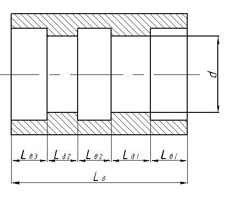 Рисунок А.2 – Деталь с типовым обобщенным цилиндрическим отверстием Принятые обозначения: d- диаметр отверстия наименьший, мм Lд– длина детали, мм lд1 – длина первого участка протягиваемого отверстия, мм lд2 – длина второго участка протягиваемого отверстия, мм lв1 – длина выточки на правом торце детали, мм lв2 – длина внутренней выточки или паза в детали, мм lв3 – длина выточки на левом торце детали, мм Примечания: - количество участков протягиваемого отверстия и внутренних выточек или пазов в детали в общем случае может быть больше. - в данной работе рассматриваютсяособенности проектирования круглых протяжек при возможных вариантах конструкции (типе) протягиваемого отверстия на основе конструкции типового обобщенного отверстия (рисунок А.2). Варианты конструкций (типы) протягиваемых отверстий приведены в таблице П2.1 Приложения 2, Остальные параметры детали: - Величина поля допуска на диаметрпротянутого отверстияITо, мм, - Шероховатость поверхности протянутого отверстия Rа, - Диаметр отверстия до протягивания, наименьший, dп, - Марка обрабатываемого материал ОМ -Твердость материала по Бринеллю, HB, -Тип отверстия в детали ТИП (Приложение 2, Таблица П2.1), - Тип отверстия по длине: короткое при lд1 + lд2 + lв2 ≤ 5d, длинное при lд1 + lд2 + lв2> 5d (см. рисунок А.2), Примечание: В данной работе рассматриваются особенности проектирования круглых протяжек при протягивании коротких отверстий, - Тип детали по характеру стенок отверстия в детали: ТО -деталь толстостенная, ТН – деталь тонкостенная, Примечание: возникающая при протягиваниитонкостенных деталей радиальная упругая деформация стенок отверстия приводит к значительному уменьшению диаметра отверстия после протягивания, иногда соизмеримому с величиной поля допуска на протягиваемое отверстие. Это учитывается при расчетах диаметров калибрующих, запасных калибрующих и выглаживающих зубьев протяжки.