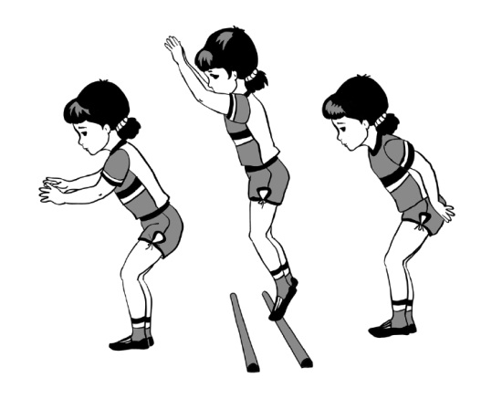 //-- Занятие 33 --// Задачи. Повторить ходьбу и бег врассыпную, развивая ориентировку в пространстве; повторить задание в равновесии и прыжках. 1-я часть. Ходьба в колонне по одному; ходьба и бег врассыпную по всему залу. Воспитатель следит, чтобы дети не наталкивались друг на друга, бегали в разном направлении. Упражнения в ходьбе и беге чередуются. Музыкальное сопровождение желательно. 2-я часть.Общеразвивающие упражнения с кольцом (от колъцеброса). 1. И. п. – ноги на ширине ступни, кольцо в правой руке. Поднять кольцо через стороны вверх, переложить его в левую руку, опустить через стороны вниз. Поочередно передача кольца. 2. И. п. – ноги на ширине ступни, кольцо в согнутых руках у груди. Присесть, вынести кольцо вперед, руки прямые, вернуться в исходное положение (4 раза). 3. И. п. – стойка на коленях, кольцо в правой руке, левая на поясе. Поворот вправо (влево), положить кольцо у носков ног; повернуться, взять кольцо, вернуться в исходное положение (по 3 раза). 4. И. п. – ноги слегка расставлены, руки произвольно вдоль туловища, кольцо на полу у носков ног. Прыжки вокруг кольца в обе стороны, в чередовании с ходьбой на месте (по 2–3 раза в каждую сторону). Основные виды движений. Равновесие. Ходьба по гимнастической скамейке (высота 30 см). Прыжки через шнуры (расстояние между ними 30–40 см) Воспитатель ставит две скамейки и на расстоянии 2 м от них кладет параллельно друг другу шнуры (по 4–5 штук). Дети становятся в две шеренги перед скамейками и после показа (на примере двух детей) выполняют ходьбу по скамейке, руки на поясе, в умеренном темпе. Воспитатель напоминает, что спину и голову надо держать прямо, сохраняя при этом равновесие. Педагог находится между скамейками и осуществляет страховку, дает указания. Затем дети приступают к выполнению прыжков – перепрыгивание на двух ногах через шнуры. Выполнив упражнение, дети обходят пособия с внешней стороны и становятся в свою колонну. Подвижная игра. «Мыши в кладовой». 3-я часть. «Где спрятался мышонок». //-- Занятие 34 --// Задачи. Упражнять детей в ходьбе и беге между предметами; в прыжках со скамейки на полусогнутые ноги; в прокатывании мяча друг другу. 1-я часть. Ходьба и бег в колонне по одному между предметами. По одной стороне зала воспитатель ставит кубики 8—10 штук (расстояние между предметами 40 см); по другой стороне – набивные мячи, также несколько штук. Дети выполняют ходьбу между кубиками «змейкой», а между набивными мячами – бег. Главное в ходьбе и беге – не задевать за предметы и соблюдать дистанцию друг от друга. Дети колонной по одному выполняют задания в ходьбе и беге (2–3 раза). 2-я часть.Общеразвивающие упражнения с мячом. 1. И. п. – ноги на ширине ступни. Мяч в обеих руках внизу. Поднять мяч вверх, поднимаясь на носки; опустить мяч, вернуться в исходное положение (4 раза). 2. И. п. – ноги на ширине плеч, руки в согнутых руках у груди. Наклониться, прокатить мяч от одной ноги к другой; выпрямиться, вернуться в исходное положение (4 раза). 3. И. п. – ноги на ширине ступни, мяч в согнутых руках у груди, присесть, вынести мяч вперед; подняться, вернуться в исходное положение (4–5 раз). 4. И. п. – ноги слегка расставлены, мяч в согнутых руках у груди. Прыжки на двух ногах (кругом), с поворотом в обе стороны, с мячом в руках (по 2 раза в каждую сторону). Основные виды движений. Прыжки «Парашютисты». Дети-«парашютисты» распределяются 