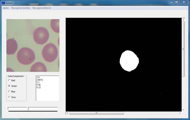 Рис.12 Изображение клетки крови в программе Project1 Изображение бинаризуется по зелёной компоненте и выставляется порог бинаризации такой, чтобы после обработки изображения появилось чётко выраженное ядро клетки белого цвета. На панели задач программы существует кнопка " Recognizer(white)", нажав на которую, программа считает характеристики изображения, состоящего из белых пикселей (Рис.13). Одна из этих характеристик - значение количества белых пикселей на изображении, примем его за площадь объекта.