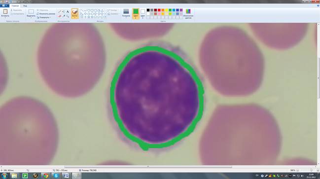 Рис.8 Изображение клетки крови в программе Paint Первая серия измерений начинается с обведения зелёным цветом ядер клеток крови в обычном масштабе редактирования изображения (Рис.9, Рис.10) Цвет был выбран зелёный, потому что впоследствии изображение будет бинаризовано по зелёной компоненте, поэтому этот контур не будет виден.