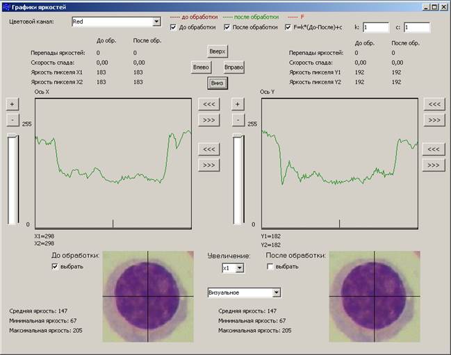 Рис.17 Настройка инструмента программы " Графики яркостей". Далее необходимо более качественно совместить центр осей X и Y с центром ядра клетки, воспользовавшись кнопками " Вверх", " Вниз", " Влево", " Вправо", расположенных вверху окна (Рис.18).