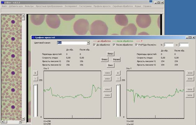 Во втором методе повышения точности измерений морфологических характеристик будет произведён анализ влияния шумов на точность измерений. Для исследования второго метода использовались 10 изображений гематологических препаратов, снятых по очереди, и программа " LFilter.0.1.5", написанная аспирантом Даниловым (Рис.16).