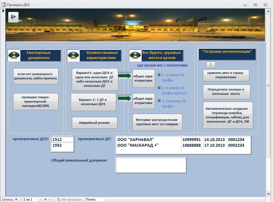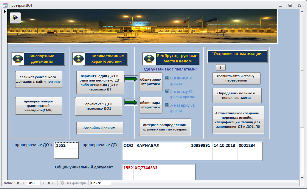 Рис. 22 Пример форма сверки данных в целом, вариант 1 Форма сверки данных в целом, вариант 1, вызывает запрос «дт_до_общие характеристики». Схема приведена в приложении 4. Для случая сверки сразу несколько ДТ и несколько ДО1 запросы еще не доработаны. Отдельно вынесена функция для проверки интервала распределения грузовых мест. Как было описано раннее, из правил заполнения декларации, следует, что полностью занятые грузовые места можно узнать как разницу всех мест и указанных в скобках частей мест по каждому товару из декларации, а также подсчитать общее количество неполных мест. Так как, заранее известно общее число грузовых мест, то можно определить интервал, в который должно попадать значение общего числа грузовых мест. Нижнее значение интервала будет равно сумме полных мест и максимального значения по товарам из декларации неполных (частей) мест. Верхнее значение будет равно сумме полных мест и общей сумме неполных мест, деленной пополам.