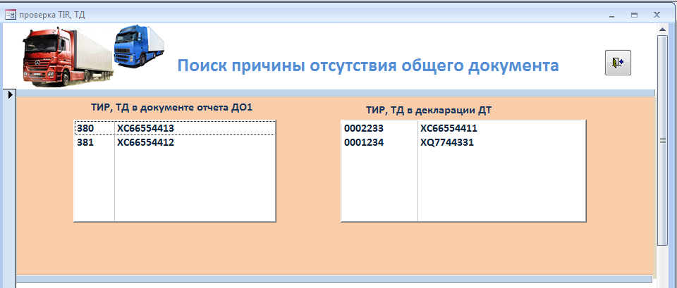 Рис. 26 Пример сверки данных, вариант 2 Форма сверки данных, вариант 2, вызывает запрос «все ДО1 –ДТ». Схема приведена в приложении 4 Аварийный режим нужен был при разработке модуля. Проверка количественных характеристик закончена. Далее можно сравнить регистрационный номер транспортного средства нажав кнопку «!» и «Сравнить авто и страну перевозчика». Текст модуля на VBA приведен в приложении № 8
