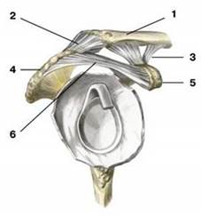 Акромиально-ключичный сустав (articulatio acromioclavicularis) (рис. 24) плоский по форме, с незначительной свободой движений. Этот сустав образуют суставные поверхности акромиона лопатки и акромиального конца ключицы. Укреплен сустав мощной клювовидно-ключичной (lig. coracoclaviculare) и акромиально-ключичной (lig. acromioclaviculare) связками (рис. 24).