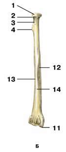 Рис. 28. Кости предплечья представлены длинными трубчатыми локтевой и лучевой костями трехгранной формы (рис. 26, 27). Эти кости соприкасаются своими проксимальными и дистальными эпифизами, в то время как их диафизы изогнуты в противоположные стороны, образуя межкостное пространство предплечья, заполненное прочной фиброзной межкостной перепонкой предплечья (membrana interossea antebrachii). Массивный проксимальный эпифиз локтевой кости имеет блоковидную вырезку (incisura trochlearis) (рис. 26, 28), поверхность которой покрыта суставным хрящом. Блоковидная вырезка ограничена сверху локтевым отростком (olecranon) (рис. 26, 28), а снизу венечным отростком (processus coronoideus). Бугристость, расположенная на передней поверхности кости ниже венечного отростка, называется бугристостью локтевой кости (tuberositas ulnae) (рис. 26, 28).