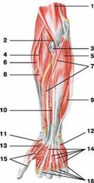 Мышцы предплечья делятся на заднюю и переднюю группы, в каждой из которых выделяют поверхностный и глубокий слои. Передняя группа Поверхностный слой Круглый пронатор (m. pronator teres) (рис. 111, 115, 116, 117, 125) пронирует предплечье (вращает его вперед и внутрь таким образом, что ладонь поворачивается кзади (вниз), а большой палец — внутрь к срединной плоскости тела) и участвует в его сгибании. Толстая и короткая мышца, состоящая из двух головок. Большая, плечевая, головка (caput humerale) начинается от медиального надмыщелка плечевой кости и медиальной межмышечной перегородки плечевой фасции, а маленькая, локтевая, головка (caput ulnare) начинается от венечного отростка бугристости локтевой кости. Обе головки, соединяясь, образуют сплющенное брюшко. Местом крепления выступает средняя треть лучевой кости. Плечелучевая мышца (m. brachioradialis) (рис. 90, 111, 113, 114, 115, 116, 118, 121, 125) сгибает предплечье и принимает участие как в пронации, так и в супинации предплечья (вращает его таким образом, что ладонь поворачивается кпереди (вверх), а большой палец — кнаружи от срединной плоскости тела) лучевой кости. Мышца имеет веретенообразную форму, начинается от плечевой кости над латеральным надмыщелком и от латеральной межмышечной перегородки плечевой фасции, а прикрепляется на нижнем конце тела лучевой кости. Лучевой сгибатель кисти (m. flexor carpi radialis) (рис. 90, 115, 121, 125) сгибает и частично пронирует кисть. Длинная, плоская, двуперистая мышца, проксимальный отдел которой прикрывается апоневрозом двуглавой мышцы плеча. Точка ее начала располагается на медиальном надмыщелке плечевой кости и фасции предплечья, а место крепления — на основании ладонной поверхности II пястной кости. Длинная ладонная мышца (m. palmaris longus) (рис. 115, 125) натягивает ладонный апоневроз и принимает участие в сгибании кисти. Характерной чертой строения мышцы являются короткое веретенообразное брюшко и длинное сухожилие. Она начинается на медиальном надмыщелке плечевой кости и фасции предплечья, кнутри от лучевого сгибателя запястья, а прикрепляется к ладонному апоневрозу (aponeurosis palmaris). Локтевой сгибатель кисти (m. flexor capiti ulnaris) (рис. 90, 115, 116, 118, 121, 125) сгибает кисть и принимает участие в ее приведении. Характеризуется длинным брюшком, толстым сухожилием и двумя головками. Плечевая головка точкой начала имеет медиальный надмыщелок плечевой кости и фасцию предплечья, а локтевая головка — локтевой отросток и верхние две трети локтевой кости. Обе головки прикрепляются к гороховидной кости, часть пучков крепится к крючковидной и V пястной костям. Поверхностный сгибатель пальцев (m. flexor digitorum superficialis) (рис. 115, 116, 120, 125) сгибает средние фаланги II—V пальцев. Эта широкая мышца прикрывается лучевым сгибателем запястья и длинной ладонной мышцей и состоит из двух головок. Плечелоктевая головка (caput humeroulnare) начинается от медиального надмыщелка плечевой кости и локтевой кости, лучевая головка (caput radiale) — от проксимального отдела лучевой кости. Головки образуют единое брюшко с четырьмя сухожилиями, которые переходят на кисть и прикрепляются каждое двумя ножками к основанию средних фаланг II—V пальцев кисти. Глубокий слой Длинный сгибатель большого пальца кисти (m. flexor pollicis longus) (рис. 115, 116, 120) сгибает дистальную фалангу I (большого) пальца. Длинная, плоская, одноперистая мышца, точкой начала имеет верхние две трети передней поверхнос