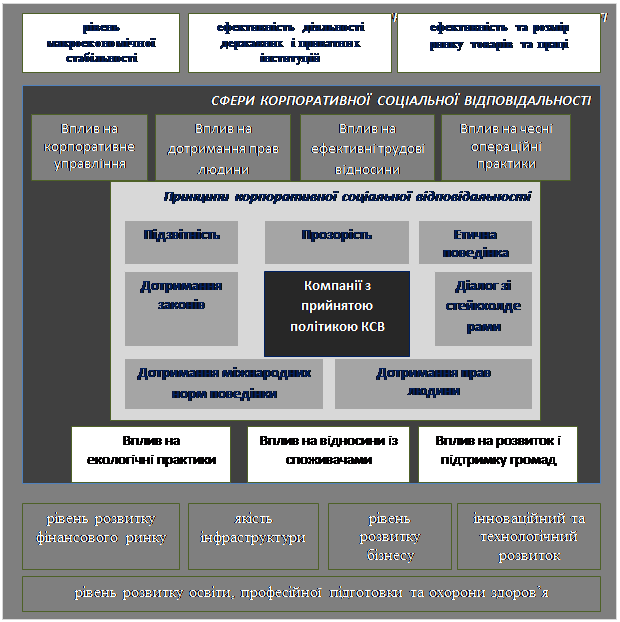 | | Висновок 4. Сприяння розвитку корпоративної соціальної відповідальності сприятиме інтеграції України до європейського економічного і соціального простору і, поступовій інтеграції до ЄС.