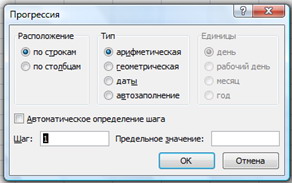 Прогрессии Для быстрого создания ряда чисел и дат можно использовать команду Прогрессия подменю Заполнить: 1. Ввести начальное значение в ячейку. 2. На вкладке Главная, в группе Редактировать выбрать команду Заполнить, затем – Прогрессия, Excel выведет окно диалога (Рис.6). 3. Выбрать необходимые параметры и нажать ОК.