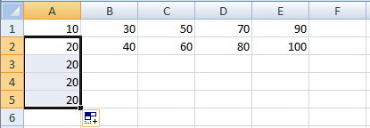 4. Если выделено текстовое значение, то при перетаскивании маркера заполнения текст копируется в новые ячейки. Но если выделение содержит и текст и число, срабатывает автозаполнение Excel, которое изменяет числовой компонент и просто копирует текстовый (Т.о. можно создать ряд Кв 1, Кв 2 и т.д.) 5. Если выделено число, например 100, то если при перетаскивании маркера заполнения удерживать клавишу Ctrl, Excel создаёт ряд 100, 101, 102 и т. д. 6. Автозаполнение определяет размер диапазона по соседнему. Например, на Рис.8 столбец А заполнен рядом значений. Можно заполнить столбец В следующим образом: ввести начальные значения ряда в В1 и В2, затем выделить диапазон В1: В2 и дважды щёлкнуть на маркере заполнения. Вновь созданный ряд закончится в ячейка В6 в соответствии с заполненными ячейками в столбце А (Рис. 9)