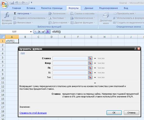 Кнопка Вставить функцию предоставляет самый простой и удобный доступ к встроенным функциям Excel. Например, чтобы вычислить размер выплат по ссуде с помощью функции ПЛТ, упоминавшейся ранее, выполните описанные ниже действия (Рис.4.4.). 1. Выделите ячейку. 2. Нажмите кнопку Формулы Вставить функцию на стандартной панели инструментов. 3. В открывшемся окне диалога Мастер функций — шаг 1 из 2 в списке Категория выберите пункт Финансовые. 4. В списке Функция выберите ПЛТ и нажмите кнопку ОК.