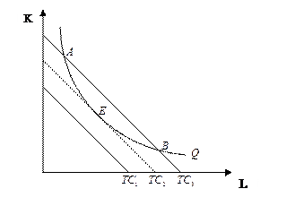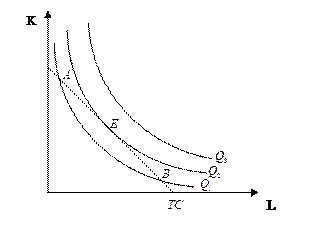Максимальному обсягу виробництва при заданому рівні витрат TC відповідатиме т. Е – точка дотику із окости з однією з ізоквант. В точці дотику кут нахилу ізокванти