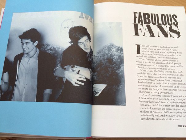 Я до сих пор помню то чувство, когда мы были в студии X Factor-а. Вокруг были фанаты, мы были так взволнованы этим, и это чувство сохранилось у меня до сих пор. Когда за пределами студии, либо площадки, где у нас проходят съемки находятся фанаты, то меня повергает это в шок. Иногда я думаю, что им будет сложно прийти и поддержать нас, но потом я вижу их и это так мило с их стороны. Когда мы выступали на The Today Snow в Нью-Йорке, мы не знали чего нам ожидать. Ведь это было наше первое важное шоу в Америке, нам было страшно. Из твиттера и фейсбука, мы знали, что у нас есть небольшое количество фанатов, которые собираются присутствовать на шоу, но в итоге все оказалось масштабней, чем мы думали. На шоу пришло неимоверное количество зрителей. Многие пытались покорить Америку, и я считаю, что нам повезло, ведь на тот момент в Америке не было бой-бендов. Мне кажется, что сейчас самое подходящее время, чтобы продвигать британскую музыку в Америке, наравне с такими артистами, как Адель и Эд Ширан. Они делают хорошую музыку. Так же фанаты помогают нам продвигать Британскую музыку по всему миру. Некоторые люди являются нашими фанатами с самого начала существования группы, и они до сих пор стараются сделать все возможное, чтобы повидаться с нами. Для нас это самое приятное, потому что мы знаем, как их зовут, и можем спокойно общаться с ними. Всегда приятно видеть так скажем «старичков»-фанатов, но еще больше приятно видеть новые лица.