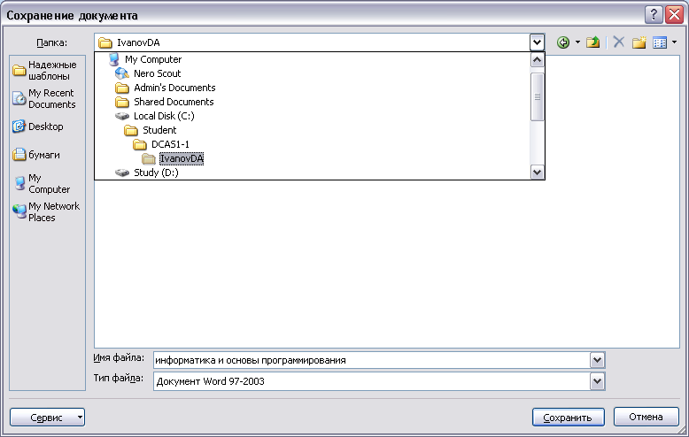 Рисунок 1.8. Диалоговое окно сохранения файла. По умолчанию система предлагает имя файла, совпадающее с первым предложением сохраняемого документа. Не забывайте указывать для сохранения именно свой каталог, обращайте внимание на сообщения системы. Для того чтобы перейти к папке последующего или предыдущего уровня, щелкайте мышью быстро дважды на каталоге последующего или предыдущего уровня в меню Папка. Система помнит всю последовательность каталогов, в которые Вы входили. Для возврата по пути каталогов используйте кнопку Для перехода к каталогу верхнего уровня существует кнопка При возникновении сомнений попробуйте открыть сохраненный файл. В своем каталоге Вы можете создавать любое количество подкаталогов (папок). В каждой папке можно также создавать любое количество папок. Для создания новой папки щелкните на кнопке