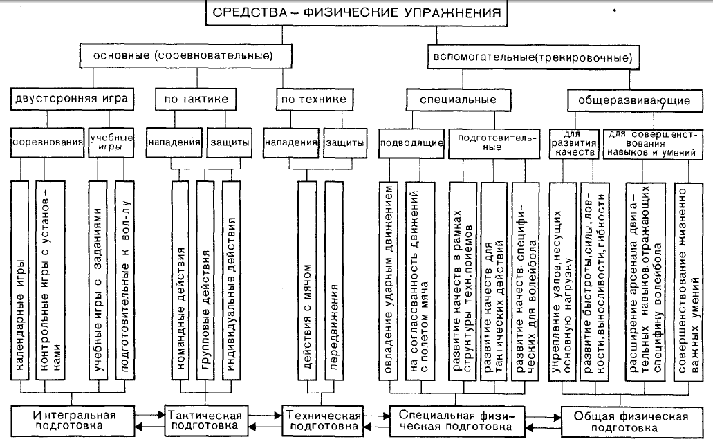 Основным средством в обучении волейболу являются физические упражнения. Их большое многообразие. Поэтому для того, чтобы выбрать те упражнения, которые в большей степени содействуют решению задач на определенном этапе обучения волейболу, их группируют на основе классификации средств (рис. 30). Отправным принципом классификации служит соревновательная деятельность волейболистов. В связи с этим все упражнения делятся на две большие группы: основные или соревновательные и вспомогательные или тренировочные.