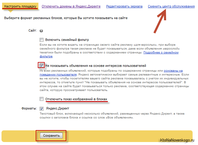 Эта настройка позволяет показывать на вашем ресурсе не тематичные ему объявления, если пользователи, которые пришли к вам, искали что-то совсем недавно в Yandex. По логике, поведенческий таргетинг должен работать только в плюс, но при довольно дорогих кликах в вашей тематике (выше 5 рублей) его работа может уменьшать ваши доходы. Так было у меня в свое время, например. Когда я отключил поведенческий таргетинг, то ощутил рост доходов. Это не аксиома. Все надо попробовать и прочувствовать именно на своем опыте, но попробовать стоит обязательно, иначе когда решитесь все же на этот шаг, то потом, возможно, будет жалеть о бесцельно потерянных доходах. Кстати, там же вы сможете отключить отображение картинок в объявлениях РСЯ — вдруг это повысит ваш доход. А из верхнего меню вы сможете перейти на вкладку «Сменить центр обслуживания», чтобы перейти в Профит Партнер из другого Цопа. Почему Профит является лучшим вариантом работы с РСЯ