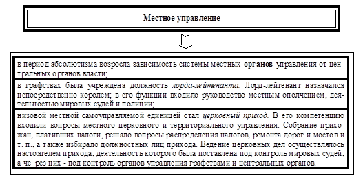 Управление на местах осуществляли шериф с помощником - - бейлифом, а также избиравшиеся в местных собраниях коронеры и констебли. Полицейскими и судебными полномочиями наделялись назначаемые королем мировые судьи. Высшими судами в этот период были Суд королевской скамьи, Суд общих тяжб и Суд казначейства. Англия в период абсолютной монархии. С конца XIV в. в Англии быстрым темпом идет преобразование феодального землевладения в капиталистическое, что означает ликвидацию барщины, падение феодальной ренты, сдачи барской земли в аренду крестьянам за сравнительно умеренную плату, уничтожение крепостного права и превращение крепостных крестьян в копигольдеров. Крупное феодальное хозяйство в течение XV в. приходит в упадок, его доходы сокращаются. Развитие товарно-денежных отношений соответствовало накоплению капитала и возникновению первых мануфактур в шерстяной промышленности. К концу XV в. - - началу XVI в. изменился облик английского дворянства, т.к. старая феодальная знать была истреблена в междоусобной войне Алой и Белой Роз. На основе средних слоев дворянства образовалось «новое дворянство» - - джентри, пополнявшееся выходцами из городской буржуазии (купцов и ростовщиков) и разбогатевшего крестьянства, которые покупали земельные владения светских и духовных феодалов с целью разведения на них тонкорунных овец. Интересы джентри были близки интересам буржуазии. Особенность экономического развития Англии этого периода - - формирование капиталистических элементов в деревне раньше, чем в городах. Быстрое развитие сукноделия, ставшего основной отраслью английской промышленности, повлекло увеличение спроса на шерсть и вызвало стремление расширить пастбища для овец. В Англии начался аграрный переворот. Не довольствуясь захватом общинных земель, крупные землевладельцы насильственно сгоняли с земли крестьян, разрушали их дома и целые деревни. Имущественное расслоение сельского населения привело к выделению: 1. фермеров- фригольдеров (freeholder - - свободное держание) как зажиточной верхушки крестьянства, эксплуатировавшей наемный труд и часто переходившей в ряды крупных арендаторов; 2. копигольдеров (copyholder - - держатель копии документа о предоставлении земли на праве аренды) как малоземельных арендаторов и безземельных батраков. Началом эпохи английского абсолютизма считаетсяправление династии Тюдоров в конце XV в. (табл. 12).