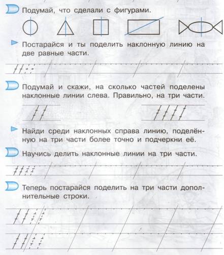 2. Деление наклонной линии на две и три части. В этой части алгоритма можно предложить ребенку сопоставить половину высоты наклонной линии с интервалом между линиями и подвести обучающегося к пониманию того, что они равны. Тем самым мы дадим ученику возможность самому определять интервал между наклонными линиями, а позднее – ширину буквы, равную половине ее высоты. Такие пропорции необходимо сохранять на протяжении всего периода обучения письму для «удобочитаемости». Нахождение третьей части наклонной линии даст нам возможность определить точное место соединений элементов и букв выше или ниже середины рабочей строки.