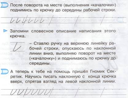 4. Письмо крючковой линии. Анализируются три вида написания крючка. Внимание останавливается на среднем. (Следует отметить, что сам крючок выписывается путем деления угла между прямой наклонной и нижней линеечкой на две равные части, тогда при написании крючковой линии до середины рабочей строки мы получаем возможность наметить ширину прописываемой нами буквы, которая будет равна половине высоты наклонной линии или половине высоты буквы.) Алгоритм написания дополняется: «Ставлю ручку на верхнюю линеечку рабочей строки, опускаюсь по наклонной линии вниз, выполняю «качалочку» и поднимаюсь по крючковой линии до середины строки». Обязательно анализируются графические ошибки. Крючковая не должна быть выгнутой или вогнутой. Итак, написание крючка подвергается детальному анализу его мелких составляющих. Это позволит в дальнейшем избежать многих графических недочетов.