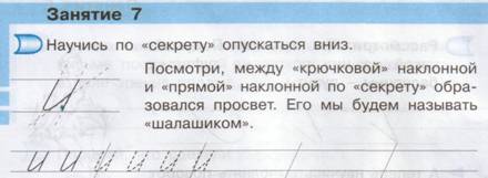 6. Письмо вниз по «секрету», т. е. написание второй наклонной линии вниз, не отрывая руки. При этом обращается внимание школьников на то, что обе линии, выполненные сверху вниз, обязательно должны быть параллельны. Между крючковой наклонной и второй прямой наклонной — просвет в нижней части строки («шалашик»).