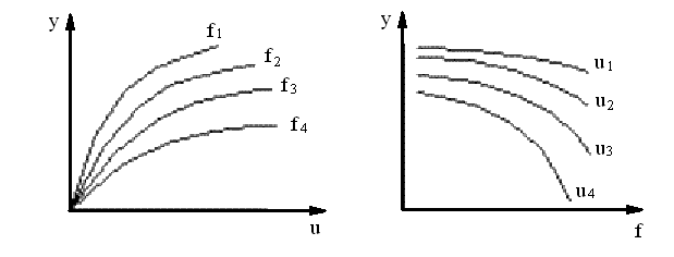 Рисунок 1 - Статическая характеристика звена с одним входом Если звено имеет второй вход по возмущению f, то статическая характеристика задается семейством кривых y = F(u) при различных значениях f или y = F(f) при различных u (рисунок 2).