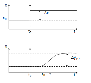 После окончания переходного процесса (выходной сигнал становится практически постоянным) полученные значения входа и выхода заносят в таблицу и т.д. При наличии нескольких входов эксперимент повторяется при различных значениях «свободных» переменных. При исследовании динамических переменных желательно иметь регистраторы с «утопленным» нулем и повышенной скоростью диаграммной ленты. Как известно, параметры линейной модели существенно зависят от рабочего режима. Поэтому исследования динамики проводят для всех основных рабочих режимов. Перед подачей испытательного сигнала объект выводится на рабочий режим и стабилизируются все возмущения на время снятия переходной кривой, иными словами, устанавливаются «нулевые» начальные условия (х = хн = const, у = ун = const). Убедившись, что нулевые начальные условия установлены, изменяют входной сигнал, одновременно на диаграмме отмечают момент нанесения воздействия и регистрируют изменение входного сигнала до нового установившегося значения. Простейшим испытательным воздействием является единичное скачкообразное воздействие х(t) = 1(t). Реакция звена (или системы) h(t) на единичное скачкообразное воздействие при нулевых начальных условиях называется переходной кривой. В реальном эксперименте (рисунок 5) амплитуда входного сигнала отлична от единицы, что в силу линейности модели приводит к пропорциональному изменению выходного сигнала. В дальнейшем это обстоятельство будет учитываться умножением h(t) на Dх. Если длительные отклонения выходного сигнала недопустимы, то на вход объекта подаются импульсные воздействия, например, как на рисунке 6. Для более точного определения переходной кривой эксперимент повторяют несколько раз, изменяя знак входного воздействия. Следует обратить внимание на своевременность регистрации момента изменения x(t), так как от этого зависит точность определения запаздывания t (рисунок 6), а также на тщательность установки начальных условий. В противном случае могут возникнуть большие ошибки при определении параметров модели.