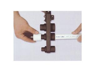 - Соединяемые поверхности полипропиленовых труб и фитингов следует очистить. Сварочный аппарат должен нагреться до 260 °C. Сварка полипропиленовых труб производится только после того, как выключится контрольный индикатор. Лицо, осуществляющее сварку, должно проверить внешнюю поверхность трубы и внутреннюю поверхность фитинга, которые были нагреты сварочным аппаратом, чтобы удостовериться, что они нагреты до необходимого состояния (необходимо убедиться – достаточно ли мягок пластик). Трубы и фитинги должны быть нагреты одновременно. Сразу после нагрева труба должна быть вставлена в фитинг и прижата по направлению оси. Не следует двигать детали во время процесса сплавления и менять их положение после первой секунды соединения. Время, необходимое для нагрева, соединения и остывания полипропиленовых труб, зависит от их размера.