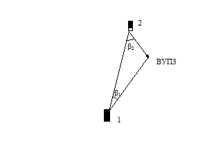 β 1=(α 1-ВУП1 – α 1-2)=78º 57΄ 56˝; β 2=(α 2-1 – α 2-ВУП1)= 55º 05΄ 30˝.
