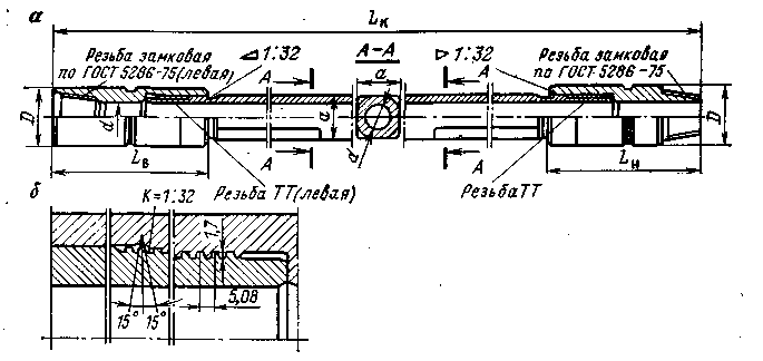 Рис. 37. Резьбовое соединение ведущих труб ТВКП: а — переводник; б — труба
