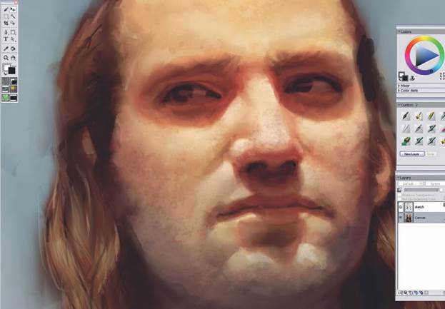 В качестве фона я хотел изобразить несколько легких облаков, не слишком детализируя их, чтобы они не отвлекали от главного персонажа. Для этого я использовал кисть " Detail Oils Brush" категории " Oils" и смешивал мастихином " Oil Palette Knife".