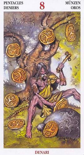 Человек с молотком в руках трудится над одним из денариев. Остальные семь уже готовы. На заднем плане виден город. Это — чеканщик монет, трудящийся не для себя, а для других. Он создает материальные или духовные ценности, которыми будут пользоваться другие люди. Он не стремится к подвигам, а просто выполняет свою работу. Поэтому в его душе царит мир: он знает, что его труд не пропадет, что он нужен людям. Этот человек свободен. В «Таро Водолея» на этой карте изображен богатый юноша, увлеченный красавицей; но, пока он разговаривает с нею, вор выуживает восемь монет у него из кармана. Смысл сюжета почти тот же, а нюанс следующий: не надейся на деньги и не копи их. В действительно важном деле они тебе не помогут; пусть уж лучше они помогут другим. На практике Восьмерка Денариев означает успех при условии, если человек не будет искать личной выгоды, особенно обогащения. Любая корысть может свести на нет все усилия. Ваш труд будет вознагражден, говорит эта карта, но скорее всего не там и не так, как вы рассчитываете; поэтому — не рассчитывайте на награду заранее. В перевернутом положении чаще всего означает напрасный труд. ОПИСАНИЕ: Молодой каменщик, возможно подмастерье (ученик), занят работой, вырезая пентаграмму (звезду) па одном из пентаклей. Еще один готовый пентакль лежит на земле, а шесть других выставлены вертикально, как трофеи. Элемент: Земля. ОБЪЯСНЕНИЕ: Называемая «Повелитель Благоразумия», Восьмерка Пентаклей ассоциируется с работой, занятостью, мастерством. Кроме того, она может указывать на то, что впереди вас ждет небольшое вознаграждение. Этот каменщик молод и неопытен по сравнению с ремесленником, изображенным на Тройке Пентаклей, однако он демонстрирует сильное желание развить и усовершенствовать свои навыки. Если вы вытягиваете данную карту, это верный признак того, что вы осваиваете какую-то новую профессию, и даже если еще не получаете существенное материальное вознаграждение за свои усилия (труды), вы определенно находитесь на правильном пути. Однако это можег также указывать на то, что вас настолько поглотила работа, что вы пренебрегаете отношениями с другими людьми. ЗНАЧЕНИЕ ПЕРЕВЕРНУТОЙ КАРТЫ: Вам нужны четкие указания и руководство. Вы все делаете неправильно: избегаете трудной работы и используете свои навыки для неэтичных целей. УРОК ДЛЯ САМОРАЗВИТИЯ: Вы обладаете значительными талантами и потенциалом, но есть шанс усовершенствовать и развить эти таланты еще больше, благодаря настойчивости и дисциплине.