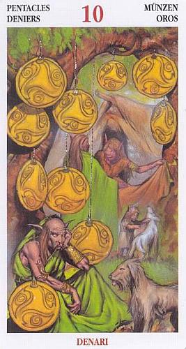 Седой человек в красивой мантии сидит в саду возле замка; он наблюдает за влюбленными, которые его не замечают. Десять денариев размещены на карте как элементы украшения. Это — человек, наконец обретший покой. Он понимает то, о чем молодые люди еще не догадываются: жизнь — это всего лишь игра. В нее можно выиграть или проиграть, но на самом деле это не имеет значения. Лишь мудрый способен отказаться от игры и вернуться к самому себе, в свой подлинный дом. Однако мудрость приходит лишь с годами. В раскладе — успех задуманного дела, хотя путь к успеху долог и труден, и ощущение покоя и счастья после его завершения. Хорошие отношения между родителями и детьми. В перевернутом виде — тоже успех, но путь к нему может оказаться таким долгим, что сам вопрошающий его не увидит. Браться ли за дело в такой ситуации, решать ему самому. Хорошие отношения между родителями и детьми возможны, но пока не реализуются, что-то мешает. В «Таро Водолея» Девятку и Десятку Денариев по значению следовало бы поменять местами. ОПИСАНИЕ: У ног сидящего патриарха расположились две собаки. На ближайшей арке находится его герб. Поблизости два других члена семьи — молодой человек и женщина — оживленно беседуют друг с другом. Эта сцена свидетельствует о клановой, или семейной, сплоченности, основанной на многолетней традиции. В средневековую семейную обстановку добавляются десять пентаклей, которые располагаются в соответствии со сферами каббалистического Древа Жизни. Элемент: Земля. ОБЪЯСНЕНИЕ: В каком-то смысле эта карта символизирует материальное процветание, престиж и семейную стабильность. Вытащив ее, вы можете быть уверены в процветании и безопасности своих личных дел, а также порадоваться вновь обретенным признанием своих заслуг в выбранной вами сфере деятельности. Однако присутствие этой Десятки Пентаклей в виде Древа Жизни напоминает нам о том, что мы являемся членами не только отдельных семей, но и сообщества духовных искателей. Важно, чтобы в нашей повседневной жизни мы стремились не только к материальному благосостоянию и процветанию, но и к духовной самореализации. Десятка Пентаклей показывает, что длительное процветание основано на духовной мудрости и понимании. ЗНАЧЕНИЕ ПЕРЕВЕРНУТОЙ КАРТЫ: Семейные неурядицы. Потеря чести или престижа. УРОК ДЛЯ САМОРАЗВИТИЯ: Достигнув успеха в материальном плане, нужно стремиться к высшим духовным сферам. Эта карта олицетворяет кульминацию нашего нынешнего мирского существования и выход в новые области духовного сознания.