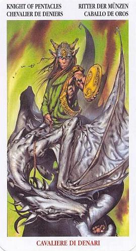 Он же Всадник, Кавалер Динариев или Воин Пентаклей. Эта карта олицетворяет человека, находящегося на середине трудного пути, в самом разгаре взятого на себя большого дела. Это может быть, например, крупная финансовая операция, научный труд или художественное произведение. И всадник, и конь устали, но путь впереди еще долгий. Рыцарь не агрессивен и щедро помогает окружающим его людям; но, давая им то, в чем они нуждаются, он не снимает с руки железной перчатки. В прямом положении — надежность, обязательность в выполнении обещаний, а иногда и просто везение, удача. В перевернутом — неблагоприятное стечение обстоятельств, невезение. ОПИСАНИЕ: Здесь показан облаченный в доспехи рыцарь с веточкой зелени на шлеме, медленно едущий на крепком коне. Обхватив пептакль, он задумчиво смотрит на него. В отдалении видна плавная холмистая местность. Элементы: Огонь- Земля. ОБЪЯСНЕНИЕ: Эта карта показывает не страсть, а выносливость и последовательность. Изображенный рыцарь, безусловно, надежен и заслуживает доверия, но ему не хватает воображения, и он едва двигается. Если вы вытащили эту карту, вероятно, вы воплощаете многие из этих качеств и двигаетесь по жизни равномерно, а не стремительно. ЗНАЧЕНИЕ ПЕРЕВЕРНУТОЙ КАРТЫ: Инерция, безделье, небрежность и нетерпение. Застой в бизнесе и финансах. УРОК ДЛЯ САМОРАЗВИТИЯ: Вы способны добиваться цели, но иногда забываете наслаждаться повседневными радостями жизни. Эта карта призывает вас вновь пробудить свое спящее страстное «я».