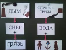 -Ребята, давайте прочитаем, почему у нас с вами в гостях появилась «Злючка –Грязючка».(Читают из учебника) 2. Работа с тетрадью стр.27 Давайте узнаем откуда появилось столько мусора. (Обсуждение тетрадной иллюстрации) 3. Работа с учебником. Решение проблемы происходит в процессе работы с учебником (с.80) Чтобы узнать, откуда грязь появилась в снежке, проследим её путь. Будем двигаться по стрелкам в обратном направлении. Положим фишку чёрного цвета на изображение стакана с грязной водой. -Откуда грязь в стакане? (Из снежка.) Положим такую же фишку на стакан со снежком. Поднимемся по стрелке вверх. Вот наш снежок. -Откуда грязь попала в него? (Из дыма автомобилей, заводов.) Положим фишки на эти части рисунка.