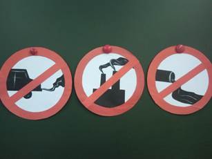 Мы узнали, как заводы, фабрики, автомобили загрязняют Землю. Давайте встанем отдохнем Вы, наверное, устали? Ну, тогда все дружно встали. Ножками потопали, Ручками похлопали. Покрутились, повертелись И за парты все уселись. Глазки крепко закрываем, Дружно до 5 считаем. Открываем, поморгаем И работать продолжаем. Игра-диалог «Как сделать так, чтобы меньше было загрязнений» Ребята, давайте прогоним Злючку- грязючку! А помогут нам в этом специальные знаки.