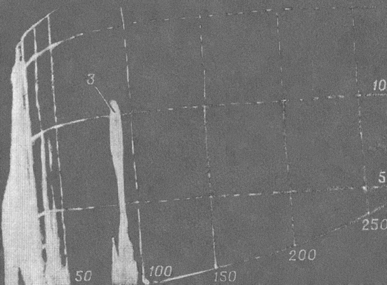 Рис. 30. Вид экрана индикатора высоты ИВ-06М с отметкой от радиоактивного облака через 7 мин после ядерного взрыва на дальности 90 км.