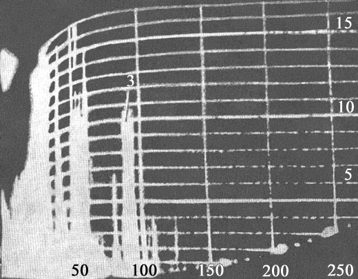Рис. 32. Вид экрана индикатора ИВ-06М с отметкой от радиоактивного облака через 41 мин после ядерного взрыва на дальности 115 км. Вслед за отметкой от ионизированной области появляется отметка от радиоактивного облака. Она возникает у нижней границы экрана, медленно нарастает по высоте и достигает своей максимальной величины в течение 5–10 мин. По форме эта отметка представляет собой широкий импульс с «раздробленной» вершиной, высота ее зависит от мощности и вида взрыва и может достигать 10–15 км и более. Скорость и направление перемещения отметки определяются скоростью и направлением ветра по высотам. При этом, если направление ветра и его скорость по высотам различны, то отметка искривляется, а в некоторых случаях наблюдается и разделение отметки на отдельные части. Высота верхней кромки отметки со временем уменьшается, отметка расплывается по дальности, яркость ее уменьшается, и она постепенно исчезает. При обнаружении на экране индикатора высоты ИВ-06М облака ядерного взрыва во время боевой работы оператор (начальник радиовысотомера ПРВ-13) докладывает ДПУ (ОД КП ртб): «ОБНАРУЖЕН ЯДЕРНЫЙ ВЗРЫВ». Определяет его координаты и докладывает: «ВЗРЫВ, 000 (азимут), 000 (дальность), ВЫСОТА ВЕРХНЕЙ КРОМКИ 000 (в гм)». Если оператору ставится задача по определению высоты радиоактивного облака, то он в режиме ручного слежения (с 30-градусным качанием) определяет высоту верхней кромки и докладывает: «ВЗРЫВ 000, ВЫСОТА 000».