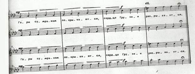 Начинается произведение с нисходящего хода женской группы хора, сначала партии С, затем А. Следует заметить, что женское пение не типично для грузинского народного многоголосия, но возможно характерно для грузинского плача. Пример №3