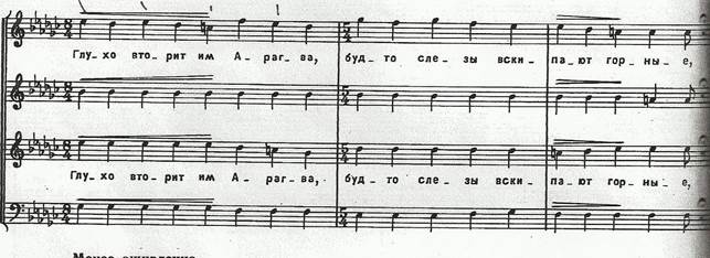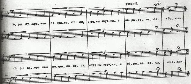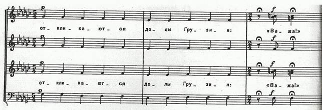 который тут же обрывается очередным возгласом «Важа!», олицетворяющим оплакивание поэта. Фактура полифоническая, присущая грузинской народной музыке. Произведение написано автором в жанре плача, жанра народной музыки, поэтому он активно использует приемы, присущие народной музыке: полифонический склад многоголосия, интервалику, метр, отталкивающийся от слова и др. Динамика произведения меняется в зависимости от текста, например: «струны звучные обрываются. Важа!» - f, «ветер рыдает в ущельях» - p. Также, композитор использует короткие cresc. и dim. (например: сразу в одном такте). В каждом такте произведения автор указал cresc. и dim. от первой доли и от третьей соответственно. Таким образом он также передает характер всхлипа, причитания, плача. Метр четвертной, размер меняется в зависимости от ударений в тексте. «Солн-це жар-ко-е, не – у-ём-ное, (5, 5) Пог-реб-ла те-бя ту-ча тём-на-я, (5, 5) Ве-тер ры-да-ет в у-щель-ях (4+4=8) – и т.д. Т.о. становится оправданным смена размера в каждой вставной конструкции «Ва-жа!»(2).