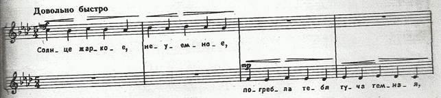 Общий диапазон данного хода ч8, но постоянное возвращение на предыдущий звук с последущим поступенным движением вниз передают интонации плача. Вторая часть состоит из 6 предложений с такими же вставными конструкциями. Они отличаются друг от друга гармонически и динамически. В первом случае – это минорная D. Во втором – это as-moll VI 7, в третьем – отклонение в F-dur. Примеры №4-6