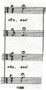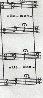 Первая часть состоит из периода с дополнением в виде возгласа «Важа»…в данном случае можно рассматривать данные вставные конструкции как всхлипы, встречающиеся в причитаниях и плачах. Пример №2