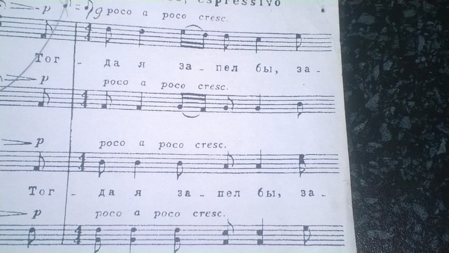 Музыкальной связи разделов способствует и ритм. Даже при переменности пульсаций (с дульной на триольную) ритмическая группа восьмая - две шестнадцатых, продолжает своё существование в разных партиях. Особенно ярко этот ритмический рисунок показан в такте 17 (см. пример 3, стр. 14), где высокая тесситура всех партий делает его наиболее выразительным, подчеркивая значимость поэтического текста. Весьма богата и интересна эта партитура динамическими оттенками. Широкий динамический диапазон партитуры от p и рр до ff связан с разнообразием настроений, передаваемых в тексте. Так от сокровенного и строгого p и mp, которыми начинается вступление и первая строфа, в 10-м такте композитор приводит нас к f. Первая большая динамическая волна, первая динамическая вершина как образ порыва чувств и эмоций, порыва души поэта, подчёркивает композитор. И, успокоившись, снова нагнетается, стремится вперёд и решительно звучит раскатистое f (такт 17, см. пример 3, стр. 14): «Тогда я запел бы, запел бы по-иному, запел бы без боли без слез». И с новой, ещё большей силой в нюансе ff повторяются те же слова (такт 20, см. пример 3, стр.14). Словно крик души прорывается после долгого томления. После чего утвердительно, уже в нюансе f звучит тема вступления и, как бы истаивая, заканчивается pp. Помимо вышеуказанных в партитуре встречаются и другие динамические обозначения. Например, sf p - нюанс, который создаёт ощущение акцента и обращает внимания на слова, на которые он приходится, а именно: «рыданья», «моей». Аналогичный эффект создаёт sf в басовой партии (такт 14). Не может не привлечь внимание обилие динамических «вилок». Они в большей степени показывают направление движения фразы, приводят ее к наиболее значимым словам. Стоит отметить, что композитор прибегает к самым различным приемам для того, чтобы выделить значимые слова. К уже ранее перечисленным выразительным средствам стоит добавить штрихи. В первой строфе Снетков обращает внимание на слово «прости», обозначив второй слог знаком tenuto (такты 7-8). Этот же штрих встречается в окончании строфы (такт 13): в партии альтов на слове «веселей». В теноровой партии подобным образом акцентами на каждом слоге обозначено слово «удалось (такт 16). Основной тональностью сочинения является h-moll. Удивительно, что композитор практически не выходит за рамки исходной тональности: модуляций нет, а как бы возникающий сопоставлением D dur в начале второй строфы (такты: 14-15) быстрыми яркими сменами гармоний (g, E, A, F, C) уводит нас снова в доминантовую сферу си минора. Такая красочность гармоний, быстро сменяющих друг друга в этом фрагменте, делает развитие более стремительным. Поэтому на фоне остального, в целом, тонально единообразного плана, такты 14-15 являются пёстрыми и интересными. Композитор ярко окрашивает поэтический текст и подчёркивает его настроение. Пример 5: