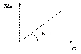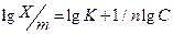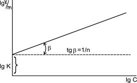В реальных случаях изотерма нелинейна. Показатель степени в уравнении Фрейндлиха характеризует нелинейность изотермы и отражает, то что по мере заполнения поверхности адсорбента теплота адсорбции падает в следствие неоднородности в энергетическом отношении поверхности адсорбента Чисто графически уравнение Фрейндлиха представляю в логарифмических координатах, т.е. логарифмируя уравнение получаем В этом случае данная зависимость имеет линейны вид – линия с углом наклона 1/n и значением коэффициента адсорбции (точка lgK), соответствующим точке пересечения прямой с осью ординат.